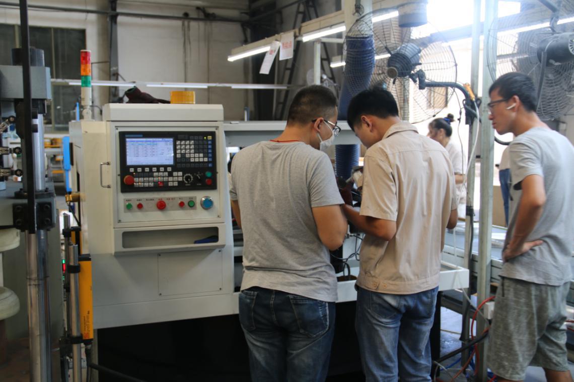 在三禾廚具的生產車間,除了一排又一排各式各樣的鍋具外,更吸引小編的是在鍋具產線上站著的那些身穿藍衣的“神秘俠客”,他們矗立在一臺臺機床之間,手臂靈活的來回抓取一件一件工件,面不改色,一絲不茍!就像武俠電影中立于陣前的俠客!