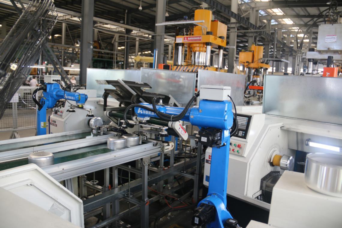 浙江三禾廚具是一家專業致力于中高端廚房用品的于科研、生產、銷售與服務一體化的浙江省明星企業。公司現有職工1200余名,年生產能力達2400萬只以上。擁有全自動的拉伸、噴涂、裝配等生產線,具有雄厚的技術力量和精優的加工設備。三禾廚具從2016開始與寧波華數機器人開展合作,主要是使用華數機器人自動化生產線,代替人工進行鍋具的打磨和上下料。