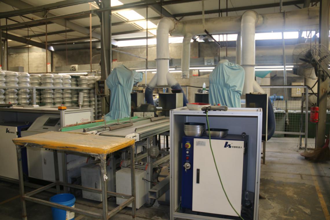 目前在三禾車間里的華數機器人自動化線有好多條,除了前面提到的藍衣俠客(小藍),還有小橙,小紅。包括2臺HSR612六軸機器人和2臺HSR410四軸機器人組成的鍋具拉伸生產線上下料;2臺HSR620六軸機器人組成的鍋具內壁打磨自動線;2臺HSR612六軸機器人,1臺HSR410四軸機器人和2臺HSR606雙旋機器人組成的鍋底打磨自動化生產線;1臺配置808xp的鍋底車邊生產線。