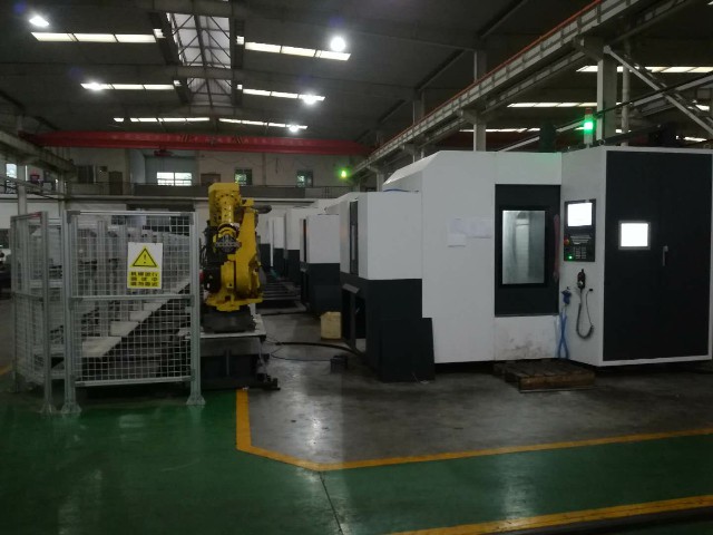 本項(xiàng)目由四川普什寧江機(jī)床有限公司生產(chǎn)的五臺臥式加工中心、1臺FANUC的6關(guān)節(jié)機(jī)器人、倍福控制器共同組成的柔性線。其中2臺TH6363四軸臥式加工中心和2臺THMS6350臥式加工中心裝配華中8型HNC-848C系統(tǒng)。