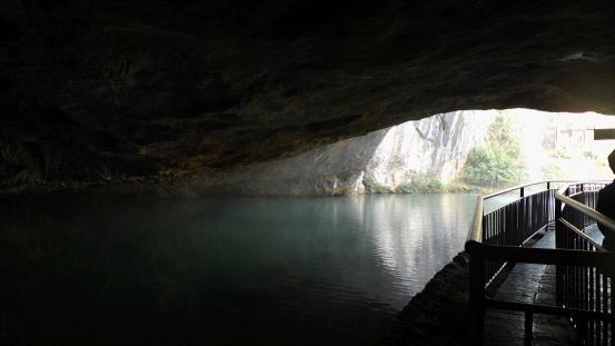 遠(yuǎn)遠(yuǎn)地,一座巨大的山峰出現(xiàn)在眼前,紅色的三個大字“隱水洞”映入眼簾。接近洞口,感覺陣陣涼意,大家不禁裹緊衣服或增添衣物。隱水洞因洞中隱藏有兩條河流而得名。全長約5180米,其中三分之一為水路,乘船觀光;三分之一為陸路,步行零距離接觸古老的巖溶地貌;三分之一需要乘小火車參觀游覽,獨(dú)特的游覽方式全亞洲第一,是湖北省首家地質(zhì)公園。
